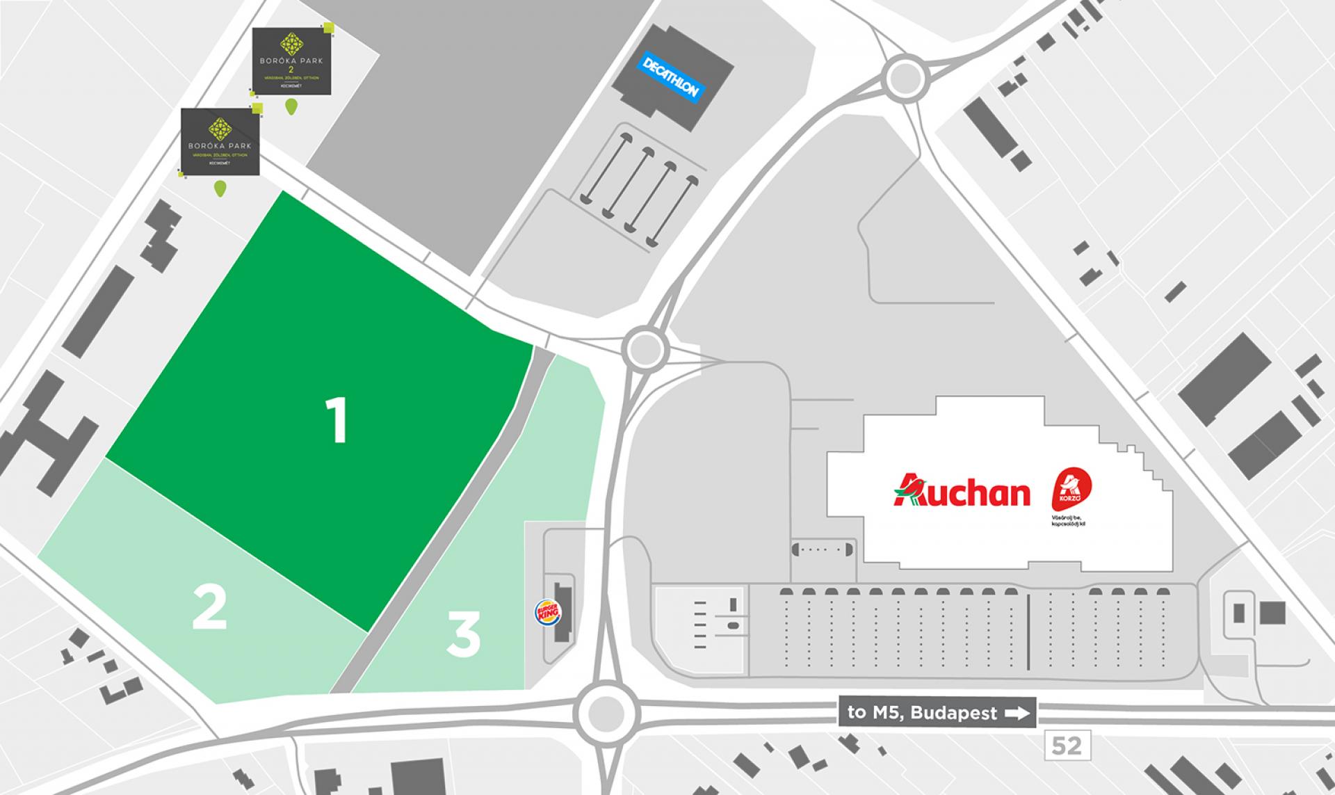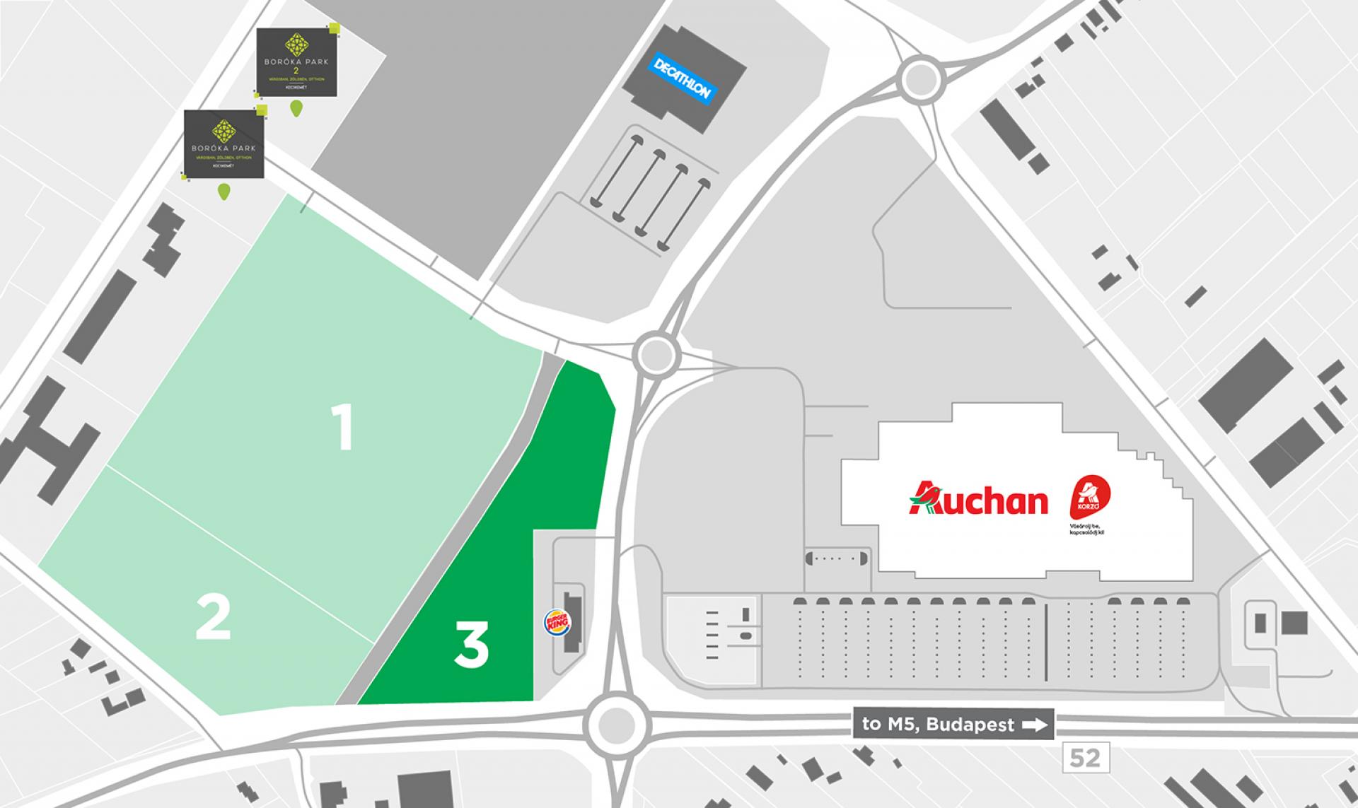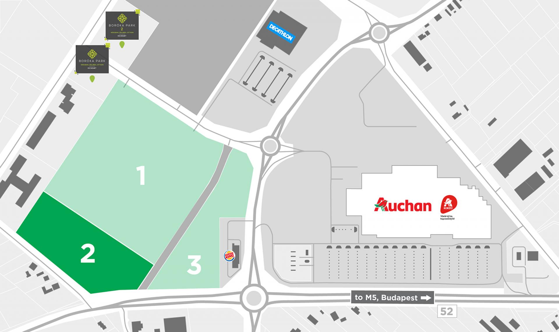 The development area is located between the M5 motorway and the center of Kecskemét, on the Izsáki road section of the main road 52, in the inner area of Kecskemét. The Auchan hypermarket, Decathlon and residential buildings are located in the neighborhood. All essential utilities can be found in the surroundings of the property.