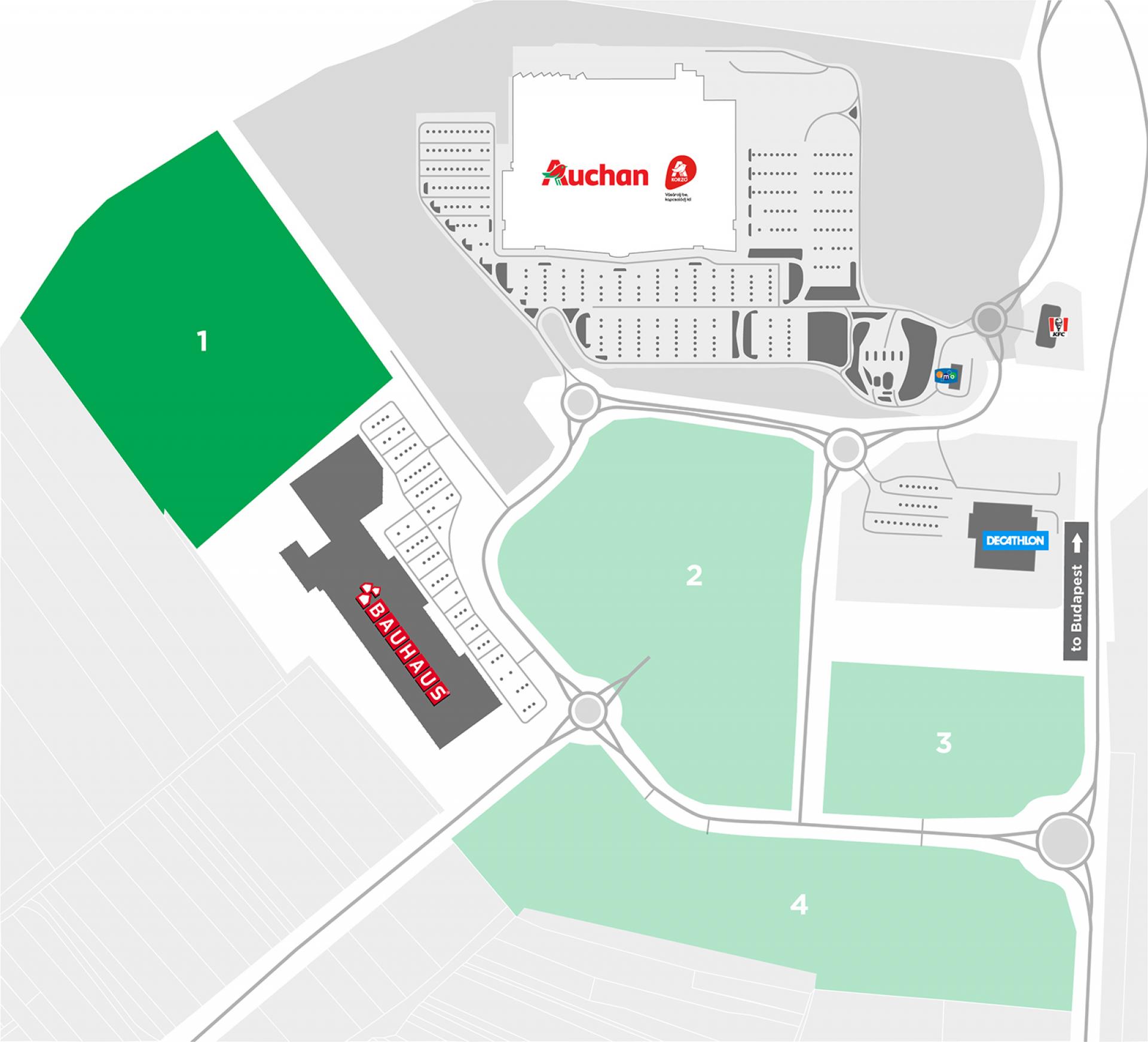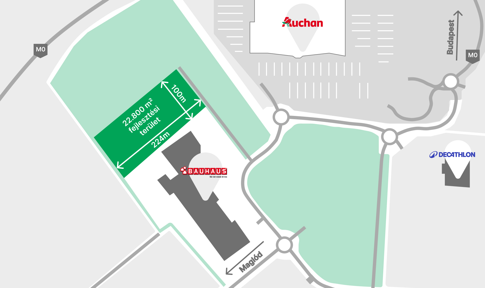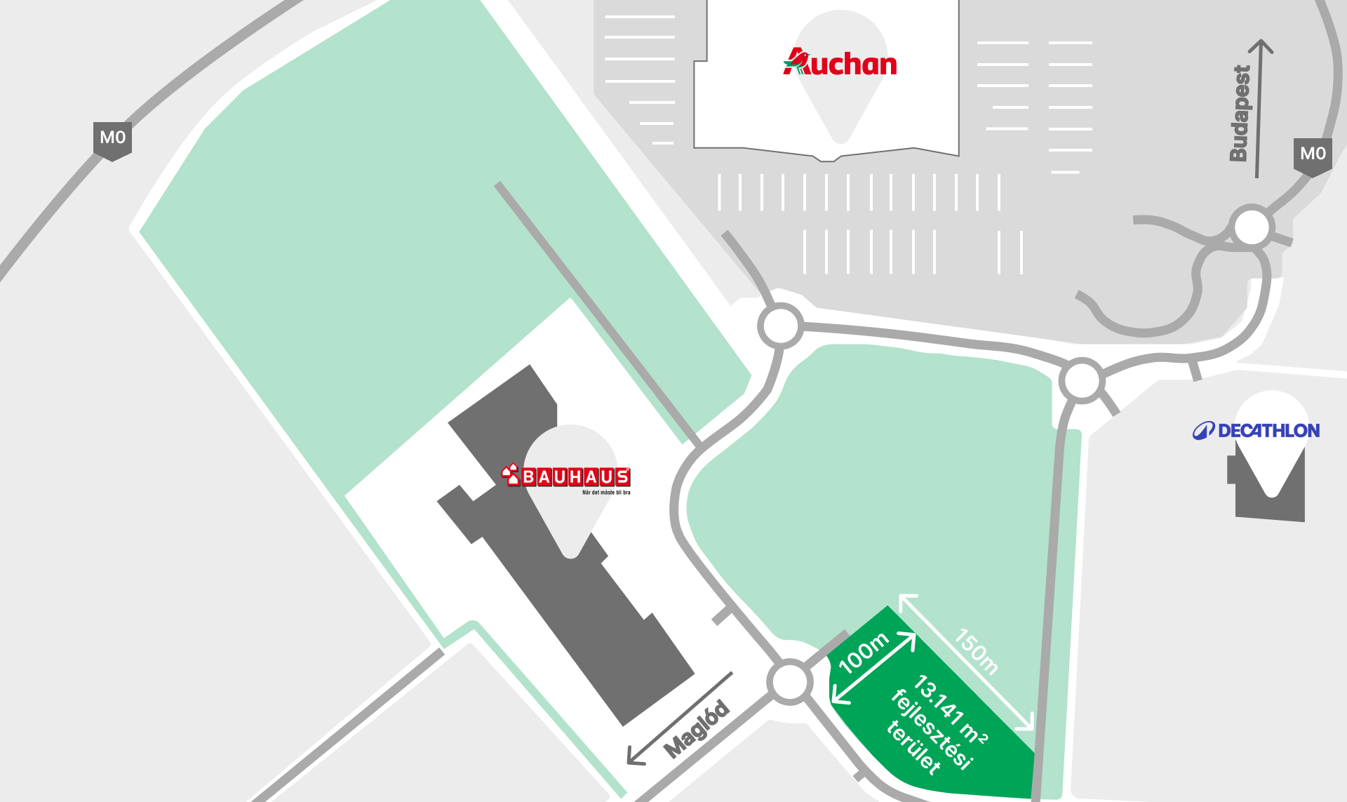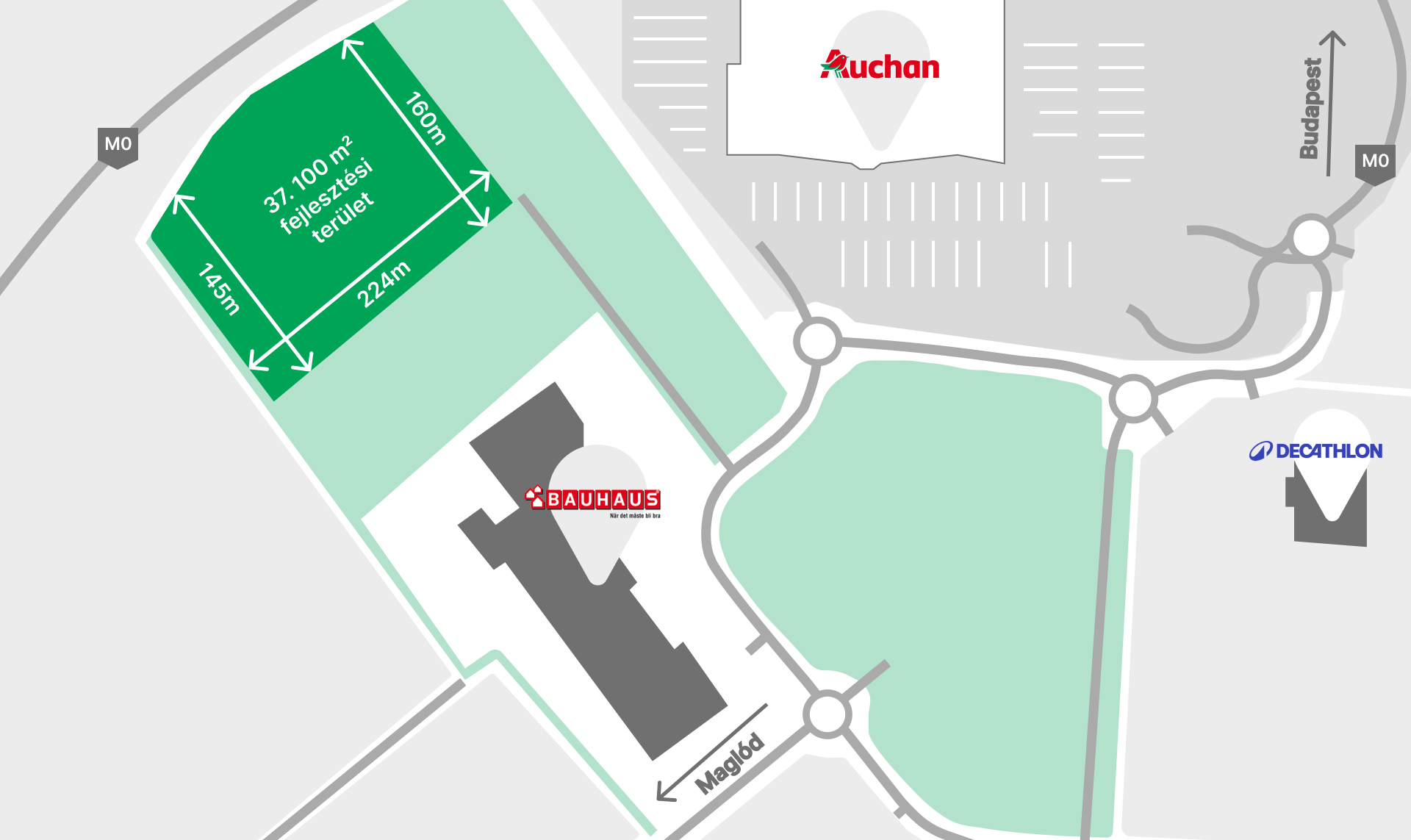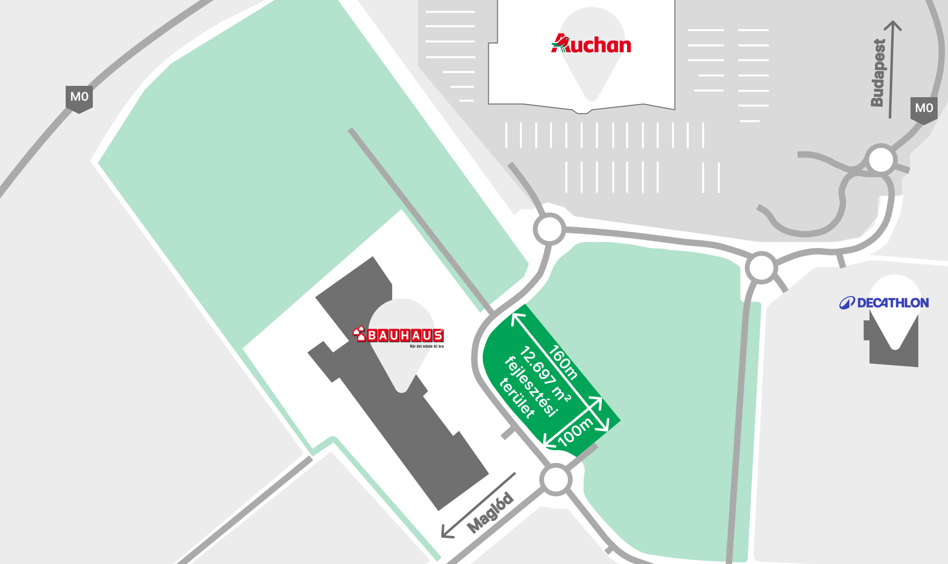 The group of development plots is located in the Auchan commercial center in Maglód. Along the M0 motorway, with excellent accessibility, we offer development sites for commercial, service and economic activities. Some of the plots are easily accessible from the internal road network via roundabouts. The development plots are pre-paved.