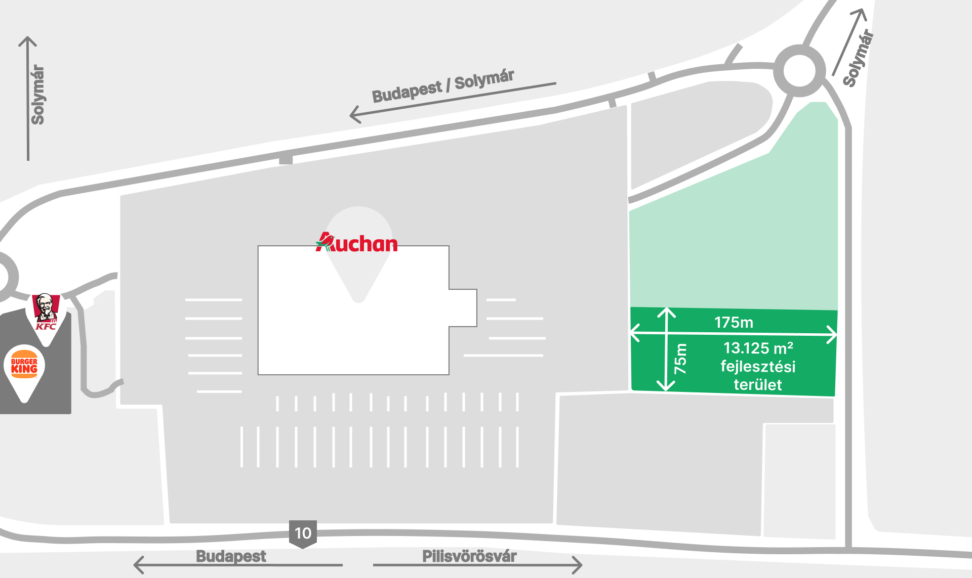 The development area is located within the Auchan Retail Park, bounded by the main road 10 and the Outer Railway Road. The internal road network of the retail park passes in front of the site, where the utility backbone lines are accessible.